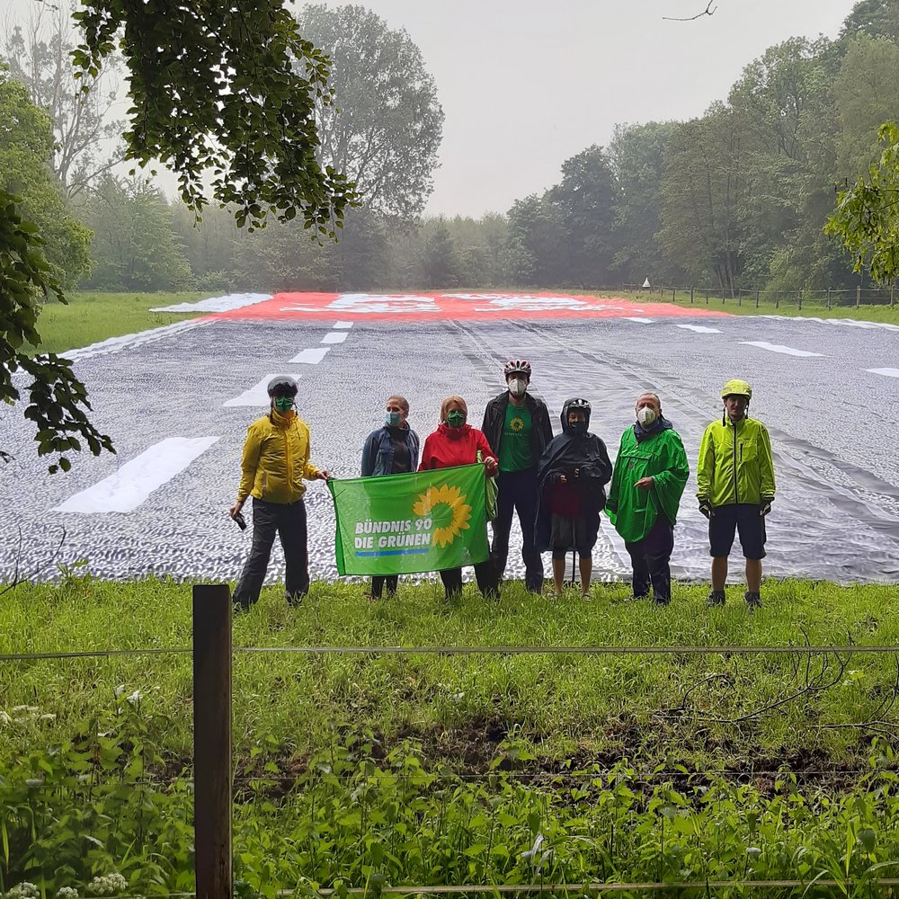 Der Fahrradkorso unter Beteiligung von ca. 500 Menschen war Teil des bundesweiten Aktionstages "Verkehrswende jetzt-Autobahnbau stoppen". Um die Ausmaße der geplanten Autobahn zu demnonstrieren, legte die Initiative Campact bei Rastede ein 4.500 m² großes Banner aus.