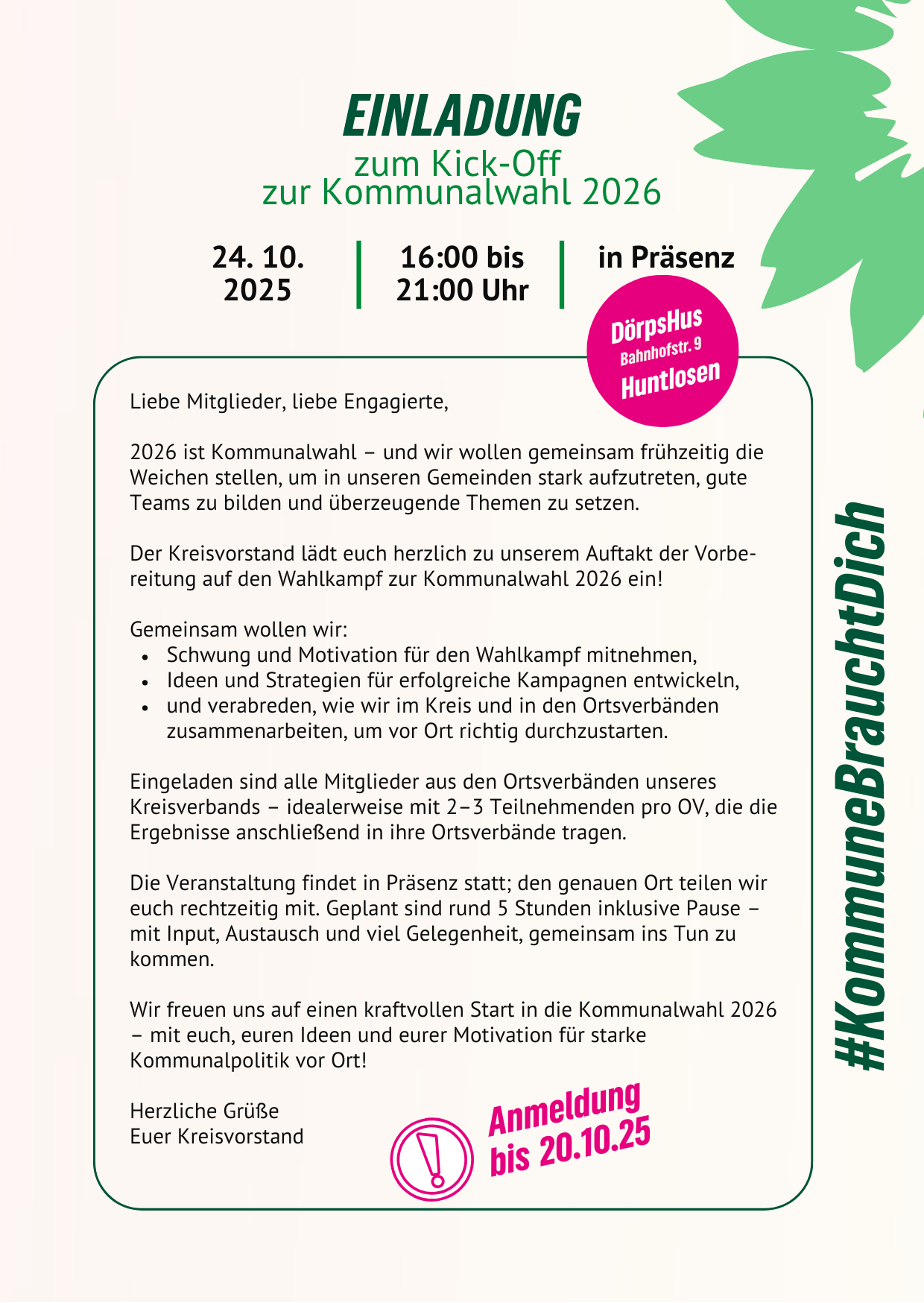 15. Januar 2026, ab 19 Uhr im Grünen Büro (Hude, Parkstaße 68) Thema: Grüne Strukturen und Blick…