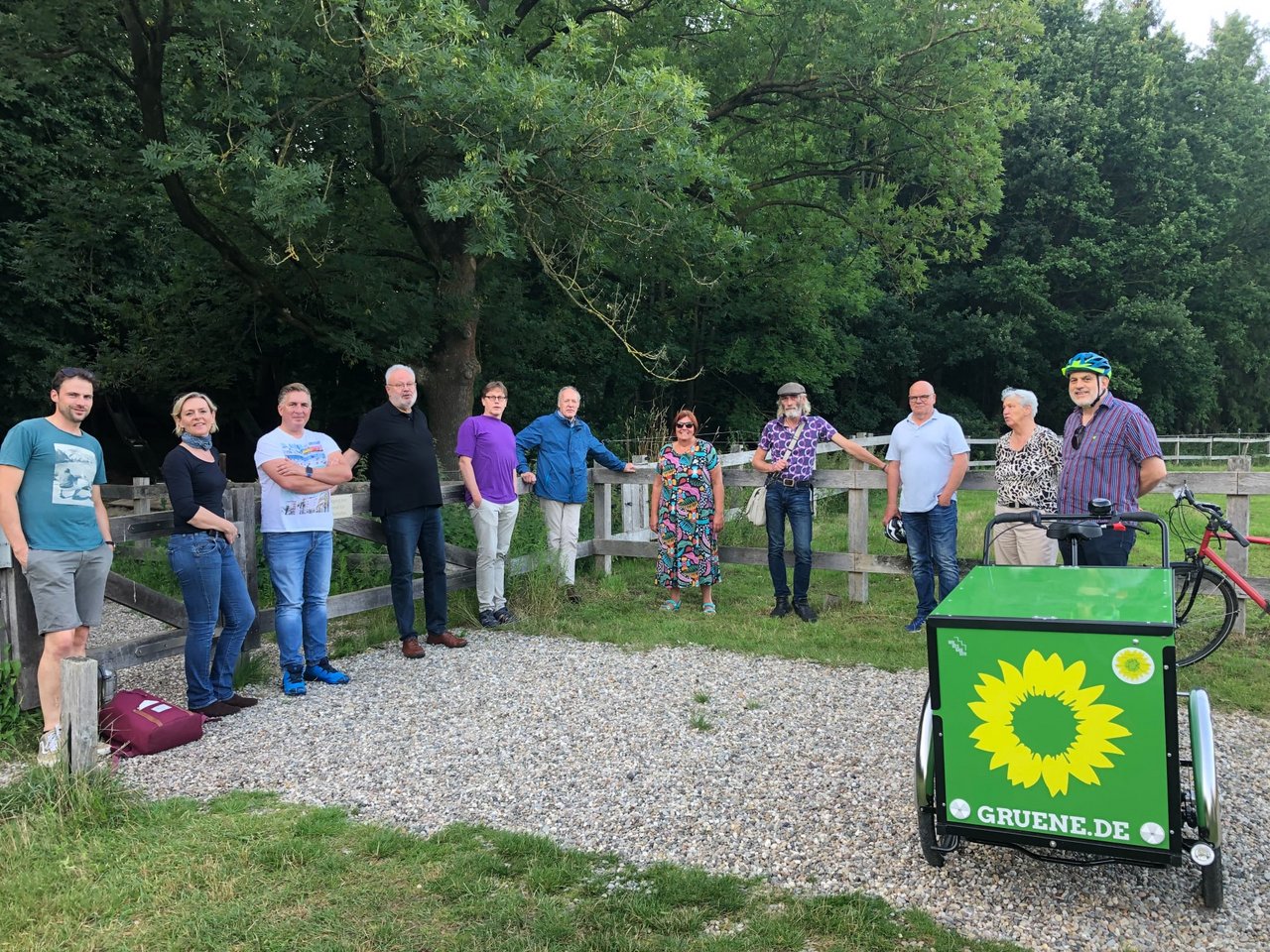 Die Kommunalwahl könnte zur Schicksalswahl für das Industriegebiet Wildeshausen West werden. Jedenfalls prallen Befürworter und Gegner in dieser Frage hart aufeinander. Die Gegner – GRÜNE, UWG, Linke und unabhängige Ratsvertreter - haben bislang die Planungen im Stadtrat nicht verhindern können, aber mit neuen Mehrheiten durch die Wahl am 12. September kann das Projekt noch gestoppt werden. Darauf hoffen zahlreiche Aktive und Interessierte, die sich am Mittwoch im Rahmen der Grünen Sommerradtour in Steinloge mit Detlef Bahrs und Reinhard Meiners von der Interessengemeinschaft der Anwohner austauschten. Sogar der Investor, die Nanz-Gruppe aus Stuttgart, macht sein weiteres Engagement von den örtlichen Mehrheitsverhältnissen abhängig. „Wir spüren eine große Unruhe in der Bevölkerung und werden bei den Wahlveranstaltungen ständig auf diese Frage angesprochen. Die BürgerInnen verstehen nicht, wie in Zeiten des dramatischen Klimawandels an solch einem Wahnsinnsprojekt festgehalten wird. Leider können gegen Bauplanungen keine Bürgerbegehren angestrengt werden, ein solches würde das unmittelbare Aus für Wildeshausen West bedeuten.“ ist sich der GRÜNE OV-Vorstand Klaus Schultze sicher. Langsam erreicht die Verunsicherung auch die Befürworter. „Die Stellungnahmen der Bürgermeisterkandidaten sind windelweich. Der Stadtrat hat 2020 beschlossen, in seinen Beschlüssen dem Klimaschutz sehr hohe Priorität einzuräumen. Wo bleibt hier die Konsequenz?“ mahnt der Wildeshauser NABU-Vorsitzende Wolfgang Pohl an. DIE GRÜNEN weiter: „Der versprochene Nutzen für die Stadt steht in den Sternen. Das Gerede von einer nachhaltigen Entwicklung des Industriegebiets ist irreführend und substanzlos. Der Wald von Steinloge wird den Interessen einzelner Unternehmen geopfert, am Ende wird nur die Logistikbranche und der Massengüterverkehr auf der Autobahn profitieren. Aktuell konkret absehbar ist allein, dass ein Autohof entstehen wird. Wildeshauser Betriebe werden kaum gewillt oder in der Lage sein, die explodierenden Flächenpreise zu bezahlen.“ Das Projekt wird sich möglicherweise auch so totlaufen. Die Anwohner in Steinloge machten sehr deutlich, dass sie gegen die Bebauungsplanung klagen werden. Jahrelange Justizverfahren sind zu erwarten. Die rund 40 vor Ort versammelten aktiven Gegner, unter ihnen auch Vertreterinnen des NABU und des BSH, setzen auf politische Einsicht. Gemeinsam mit den Umweltverbänden werden sie eine Aufklärungskampagne starten und im Internet Informationen und Argumente präsentieren. „Wenn die Mehrheitsparteien nicht zur Vernunft kommen, sind auch Aktionen des zivilen Ungehorsams nicht auszuschließen. Ich bin gespannt, wie die auf ihr Image bedachten Investoren reagieren, wenn sie Waldschützer von den Bäumen sägen müssen.“, so der Grüne Kreisvorstand Eduard Hüsers.