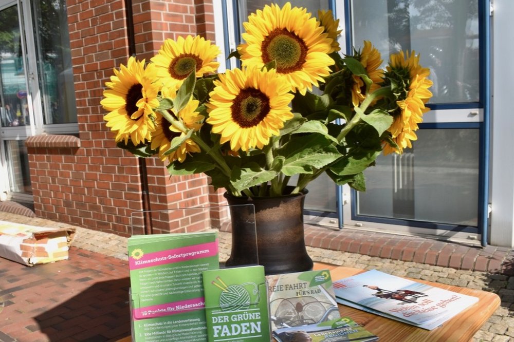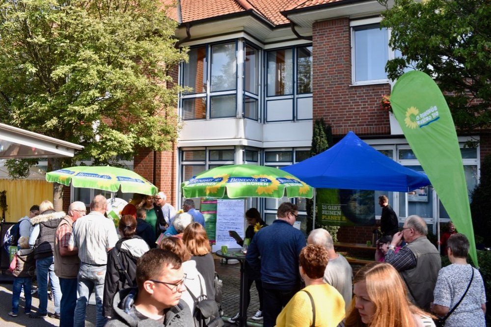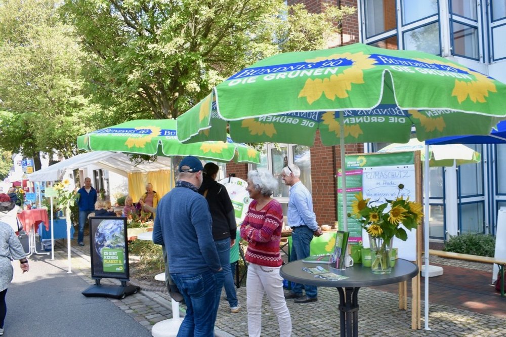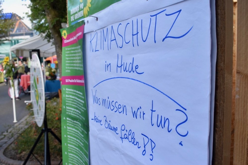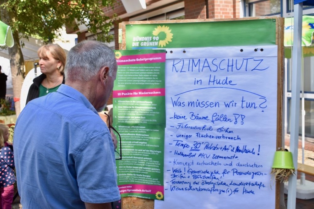 Was können wir konkret in Hude tun, um das Klima zu schützen, fragten wir auf unserem Infostand auf dem Bürgerfest in Hude. Anlass für die Frage ist unter anderem das 10-Punkte-Sofortprogramm für den Klimaschutz der Grünen in Niedersachsen. So kamen wir mit interessierten Bürger*innen nicht nur bei einer Tasse Tee und Keksen ins Gespräch, sondern sammelten auch Ideen auf einem Flipchart.