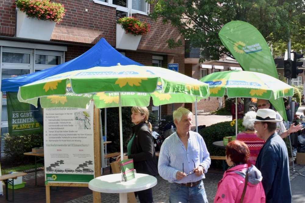 Neben der Verkehrsberuhigung und Förderung des Radverkehrs, war auch der Baumschutz, u.a. bei Neubauten und der Flächenverbrauch und die damit einhergehende Versiegelung immer wieder ein Thema in den Gesprächen. Häufig wurde Tempo 30 auf der Parkstraße gefordert, etwas was wir als Grüne in Hude schon lange fordern und unterstützen. Auch zur Förderung des Radverkehrs in Hude machen wir uns stark und haben hierfür jüngst einen Antrag gestellt, welcher den Radverkehr in Hude Süd stärken soll. Diesen Antrag haben wir auf dem Infostand präsentiert und mit interessierten Bürger*innen diskutiert.