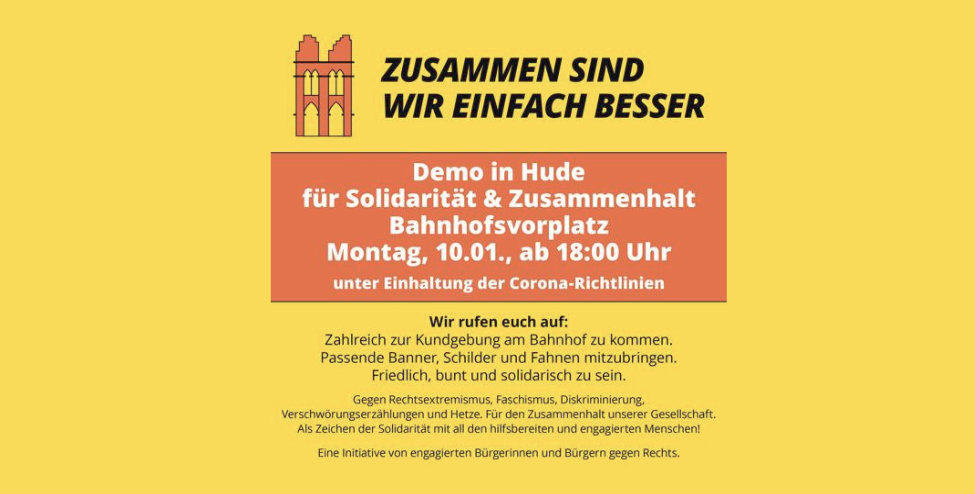 Wir rufen zu einer friedlichen Kundgebung am kommenden Montag (10.01.22) ab 18 Uhr auf dem Bahnhofsvorplatz in Hude auf. Wir wollen gemeinsam ein Zeichen gegen Rechtsextremismus, Faschismus, Diskriminierung, Verschwörungstheorien und Hetze setzen.